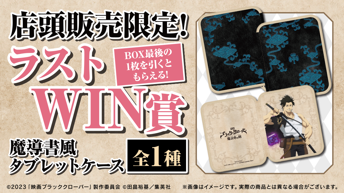 このくじはBOXタイプです! くじのタイプについて現在このくじは販売していません販売店舗一覧魔導書風タブレットケース全3種類魔導書をイメージしたタブレットケース(アスタ・ユノ・ノエル) サイズ(閉じた状態):H240×W190mm程度 素材:ポリエステル立体アクリルスタンド全7種類パーツを組んで立体的に飾るアクリルスタンド サイズ(板):H210×W148mm内×2 素材:アクリル(3mm厚)A3アートボード全8種類描き下ろしイラストを飾って楽しめるA3サイズのイラストボード サイズ:A3(H420×W297mm) 素材:厚紙(合紙)アクリルキーホルダー全7種類厚めのアクリルに両面印刷のスティックキーホルダー サイズ:H60×W15mm 素材:アクリル(5mm厚)缶バッジセット全14種類描き下ろし+団マークのセットと、映画の場面写を使用した缶バッジ サイズ:Φ54mm 素材:ブリキ魔導書風タブレットケース全3種類魔導書をイメージしたタブレットケース(ノゼル・フエゴレオン・メレオレオナ) サイズ(閉じた状態):H240×W190mm程度 素材:ポリエステルイラストカード全7種類1会計につき5枚購入ごとに、ランダムで1枚必ずもらえる! サイズ:H86×W54mm 素材:ユポ紙/ラミネート魔導書風タブレットケース全1種類魔導書をイメージしたタブレットケース(ヤミ) くじ購入枚数がそのまま応募数に! くじを購入されたお客様の中から抽選で10名様にプレゼント!