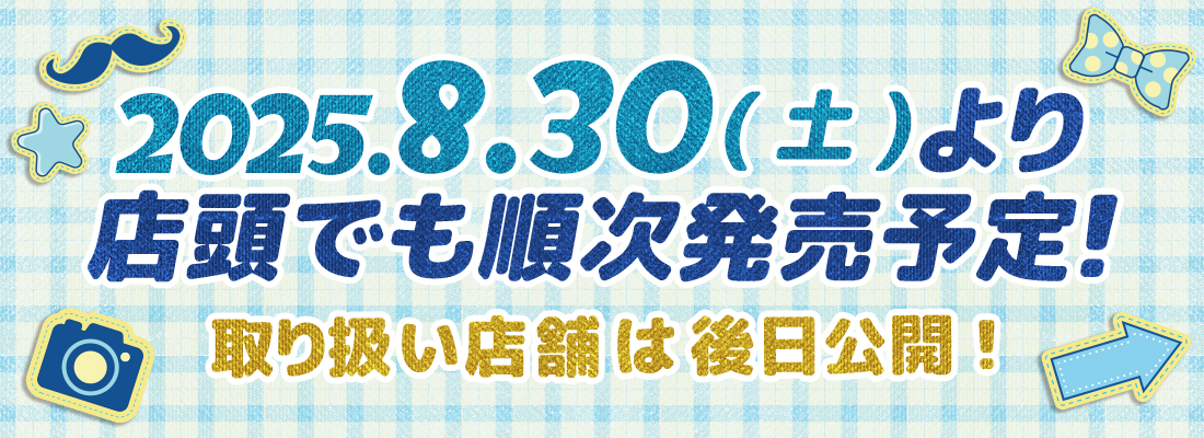 このくじはBOXタイプです! くじのタイプについて現在このくじは販売していません販売店舗一覧BIGバスタオル全1種類描き下ろしイラストを使用した特大サイズのタオルです♪ サイズ:H600mm×W1200mm 素材:ポリエステル,綿デニムトートバッグ全1種類今回の衣装とモチーフをイメージした実用的でおしゃれなデニムトートバッグです♪ サイズ:約W310mm×H370mm×D100mm 素材:コットン アクリルスタンド全8種類描き下ろしイラストを使用したアクリルスタンドです! サイズ:H150mm×W100mm内 素材:アクリル(3mm厚)台座つきアクリルカード全8種類台座に立てかけられるアクリルカードです♪ サイズ:H90mm×W45mm 本体素材:アクリル(1mm厚) 台座部分:アクリル(3mm厚)アクリルキーホルダー全8種類いつでも一緒に持ち歩けるアクリルキーホルダーです♪ サイズ:H70mm×W50mm内 素材:アクリル(3mm厚),金属A4アートボード全8種類描き下ろしイラストを楽しめるA4サイズのアートボード! 額に入れて飾ると素敵です♪ サイズ:H297mm×W210mmほど(A4相当) 素材:厚紙(合紙)大缶バッジ全8種類大きいサイズのコレクション缶バッジです♪ サイズ:Φ76mm 素材:ブリキ特大アクリルスタンド全8種類BOXのくじをすべて引き終えると必ずもらえる豪華特典! 高さなんと約30cmの超特大サイズのアクリルスタンド! ※オンライン販売と店頭販売で商品が異なります。 サイズ:高さ約300mm(キャラによって異なる) 素材:アクリル(3mm厚)コースター全8種類1会計につき5枚購入ごとにランダムで1枚必ずもらえる、全8種のコースター! (10枚まとめて購入時はランダムで2枚もらえます) サイズ:H90mm×W90mm 素材:厚紙アクリルパネル全1種類くじ購入枚数がそのまま応募数に! くじを購入されたお客様の中から抽選で10名様に「アクリルパネル」をプレゼント! 店頭で購入された方はくじ半券のシリアルコードを使って応募いただけます。 サイズ:H150mm×W235mm(金具パーツ2個付属) 素材:アクリル(3mm厚),金属