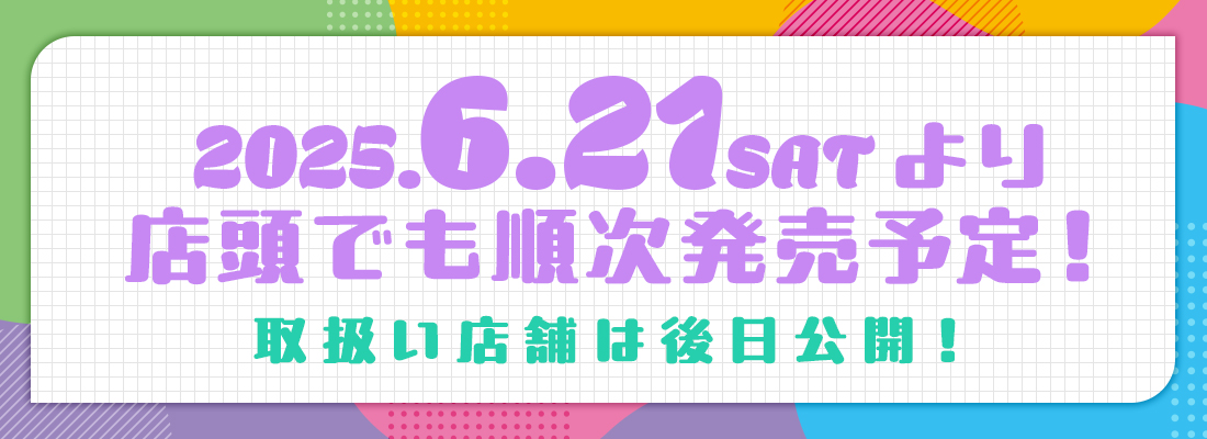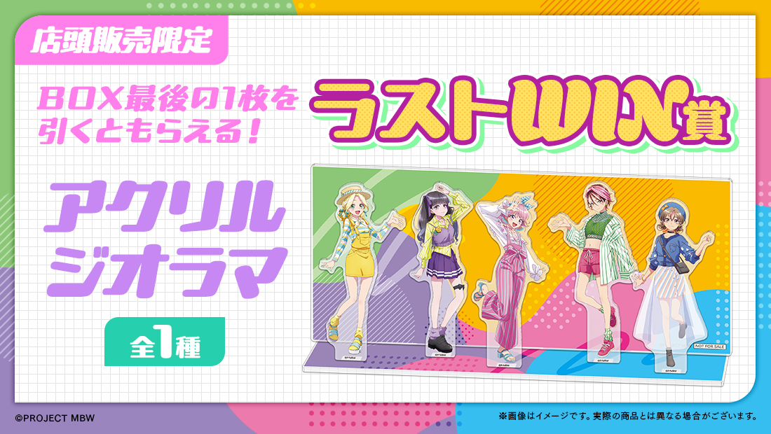 このくじはBOXタイプです! くじのタイプについて現在このくじは販売していません販売店舗一覧BIGバスタオル全1種類描き下ろしイラストを使用した特大サイズのタオルです♪ サイズ:H600mm×W1200mm 素材:ポリエステル,綿A3クリアポスター全1種類大きく飾れるA3サイズのクリアポスターです♪ サイズ:H297mm×W420mm 素材:PP(ポリプロピレン)アクリルスタンド全5種類描き下ろしイラストを使用したアクリルスタンドです♪ サイズ:H150mm×W100mm内 素材:アクリル(3mm厚)アクリルキーホルダー全5種類いつでも一緒に持ち歩けるアクリルキーホルダーです♪ サイズ:H70mm×W50mm内 素材:アクリル(3mm厚),金属A4アートボード全6種類描き下ろしイラストを楽しめるA4サイズのアートボード! 額に入れて飾ると素敵です♪ サイズ:H297mm×W210mmほど(A4相当) 素材:厚紙(合紙)色紙コレクション全8種類美麗な印刷を施した色紙コレクションです♪ サイズ:H100mm×W170mmほど 素材:紙(上質しらおい)大缶バッジ全10種類大きいサイズのコレクション缶バッジです♪ サイズ:Φ76mm 素材:ブリキ特大アクリルスタンド全5種類BOXのくじをすべて引き終えると必ずもらえる豪華特典! 高さなんと約30cmの超特大サイズのアクリルスタンド! サイズ:高さ約300mm(キャラによって異なる) 素材:アクリル(3mm厚)コースター全5種類1会計につき5枚購入ごとにランダムで1枚必ずもらえる、全5種のコースター! (10枚まとめて購入時はランダムで2枚もらえます) ※こちらはオンラインでくじを購入された方のみでのプレゼントとなります。 店頭での配布はございませんので、ご了承ください。 サイズ:H90mm×W90mm 素材:厚紙アクリルパネル全1種類くじ購入枚数がそのまま応募数に! くじを購入されたお客様の中から抽選で10名様に「アクリルパネル」をプレゼント! 店頭で購入された方はくじ半券のシリアルコードを使って応募いただけます。 サイズ:H150mm×W235mm(金具パーツ2個付属) 素材:アクリル(3mm厚),金属
