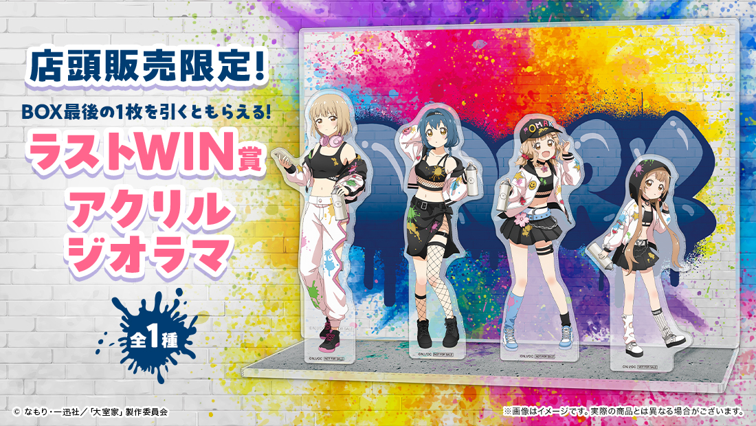 このくじはBOXタイプです! くじのタイプについて現在このくじは販売していません販売店舗一覧BIGバスタオル全1種類描き下ろしイラストを使用した、長辺120cmのBIGサイズのタオルです♪ サイズ:H600mm × W1200mm 素材:ポリエステル,綿タンブラー全4種類描き下ろしキャラクター達のタンブラー! 黒のタンブラーにキャラカラーでスタイリッシュにデザイン♪ サイズ:H135mm×φ85mm 素材:PPラゲッジタグ全4種類カバンなどに付けておくと便利なラゲッジタグです♪ サイズ: H120mm×W80mmほど 素材:PVC/PP/POM/金属パーツアクリルスタンド全4種類描き下ろしイラストを使用したアクリルスタンドです! サイズも少し大きめで飾るのが楽しくなります♪ サイズ: H150mm×W100mm内 素材:アクリル(3mm厚)フタのるマスコット全10種類ペットボトルの蓋に被せることができる、ミニキャライラストを使用したフタのるマスコット! コレクションして飾ってくださいね♪ アクリルサイズ:H70mm×W50mm内 キャップサイズ:H16.7mm×φ34mm内 本体素材:アクリル(3mm厚) キャップ部分:PEA4アートボード全6種類描き下ろしイラストとキービジュアルが楽しめるA4サイズのパネル! 額にいれて飾るのも素敵ですね♪ サイズH297mm×W210mmほど(A4相当) 素材:厚紙(合紙)大缶バッジ全14種類大きいサイズのコレクション缶バッジです♪ 描き下ろしイラスト・ミニキャライラストを使用! サイズ:φ76mm 素材:ブリキ特大タペストリー全4種類BOXのくじをすべて引き終えると必ずもらえる豪華特典!約110cmの特大タペストリーです♪ お好きな1種類をお選びいただけます。 ※オンライン販売と店頭販売で商品が異なります。 サイズ:H1100mm×W515mm 素材:ポリエステル(スエード)ポストカード全14種類一度のご注文でくじを5枚購入ごとに1枚必ずもらえます!全14種♪ (オンライン販売のみ) サイズ:H148mm×W100mm 素材:紙アクリルパネル全1種類くじ購入枚数がそのまま応募数に! くじを購入されたお客様の中から抽選で10名様に描き下ろし集合の「アクリルパネル」をプレゼント! 店頭で購入された方はくじ半券のシリアルコードを使って応募いただけます。 サイズ:H150mm×W235mm(金具パーツ2個付属) 素材:アクリル(3mm厚)/金属(足パーツ)