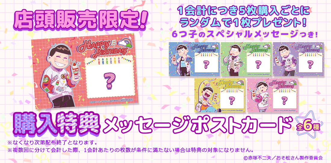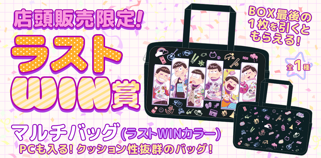 このくじはBOXタイプです! くじのタイプについて現在このくじは販売していません販売店舗一覧マルチバッグ全1種類描き下ろし集合イラストを使用したマルチバッグ!ノートパソコンや文具などを収納いただけます♪ サイズ:約H240×W360×D60mm 素材:ポリエステルA3ビジュアルパネル全2種類集合イラストを使用したA3サイズのビジュアルパネル!表情が違うver.もラインナップに♪ サイズ:H420mm×W297mm(縦型) H297mm×W420mm(横型) 素材:厚紙(合紙)タペストリー全6種類描き下ろしイラストを楽しめるタペストリー!部屋に飾って6つ子たちをお祝いしましょう♪ サイズ:H634mm×W345mm 素材:スエード/塩ビパイプ/紐アクリルスタンド全6種類描き下ろしイラストが楽しめるアクリルスタンドです! 並べて部屋に飾りたいですね♪ サイズ:H150mm×W100mm 以内 素材:アクリル(3mm厚)オーロラアクリルキーホルダー全6種類オーロラ質感がおしゃれなオーロラアクリルキーホルダー♪ サイズ:H70mm×W50mm内 素材:アクリル(3mm厚)/アルミナスカンクリアファイル&ステッカーセット全6種類実用的なA5クリアファイルとステッカーのセット!表情違いver.のステッカーがセットに♪ サイズ クリアファイル:A5縦相当(H220mm×W150mm) ステッカー:H104mm×W74mm 素材:PP,アートタック大缶バッジ全6種類大きいサイズのコレクション缶バッジです♪ サイズ:直径76mm 素材:ブリキ特大アクリルスタンド全6種類BOXのくじをすべて引き終えると必ずもらえる豪華特典!高さなんと約30cmの特大サイズのアクリルスタンドです♪ お好きな1種類をお選びいただけます。 ※オンライン販売と店頭販売で商品が異なります。 サイズ:最長300mmほど(キャラによって異なる) 素材:アクリル(3mm厚)コースター全6種類1会計につき5枚購入ごとにランダムで1枚必ずもらえるコースター! (10枚まとめて購入時はランダムで2枚もらえます) ※こちらはオンラインでくじを購入された方のみでのプレゼントとなります。 店頭での配布はございませんので、ご了承ください。 サイズ:H90mm×W90mm 素材:厚紙アクリルパネル全1種類くじ購入枚数がそのまま応募数に! くじを購入されたお客様の中から抽選で6名様に、集合絵の「アクリルパネル」をプレゼント! 店頭で購入された方はくじ半券のシリアルコードを使って応募いただけます。 サイズ:H150mm × W235mm(金具パーツ2個付属) 素材:アクリル(3mm厚)/金属
