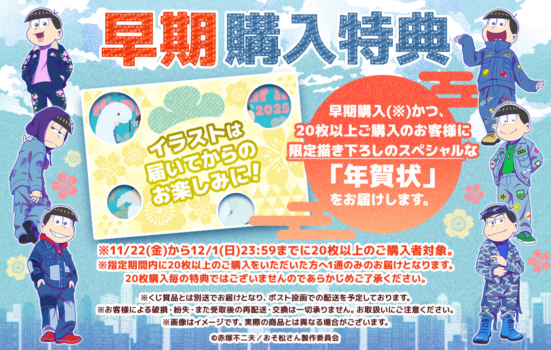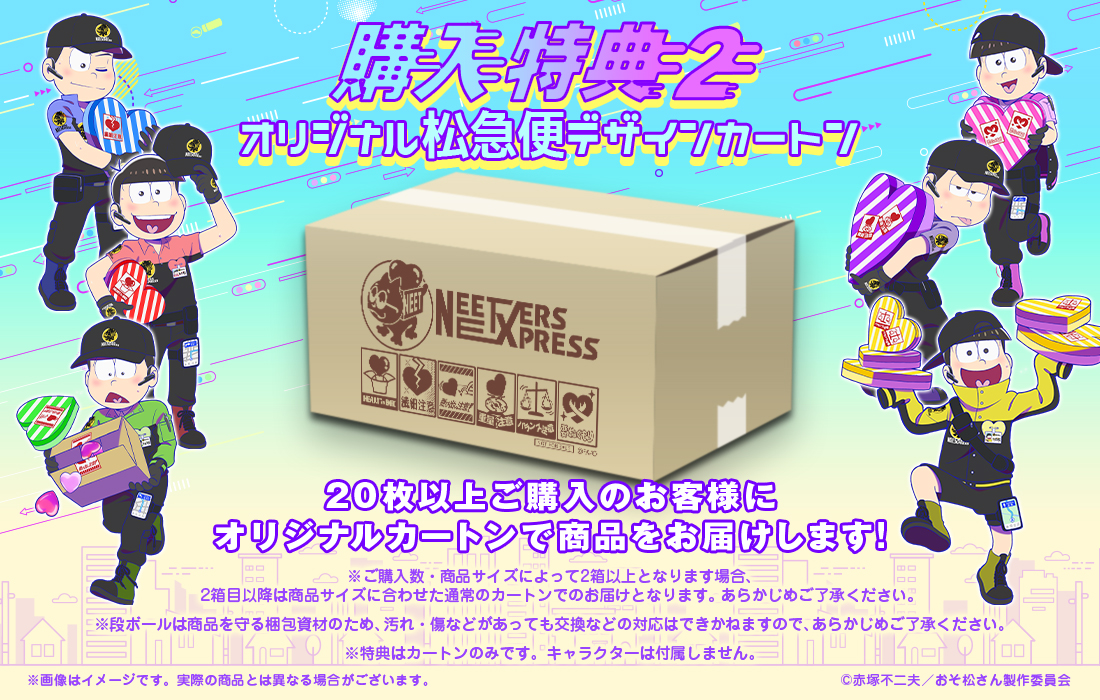 このくじはBOXタイプです! くじのタイプについて現在このくじは販売していませんBIGバスタオル全1種類描き下ろしイラストを使用した特大サイズのタオルです♪ サイズ:H600mm×W1200mm 素材:ポリエステル,綿デニムポーチ 全2種類おしゃれで便利なデニムのフラットポーチです♪ サイズ: H150mm×W230mm 素材:コットンアクリルスタンド全6種類デニム衣装がおしゃれなアクリルスタンドです! サイズ:H150mm×W100mm内 素材:アクリル(3mm厚)アクリルカラビナ全6種類バッグなどにつけられるアクリルカラビナ♪ サイズ:H70mm×W70mm内 素材:アクリル(5mm厚)アクリルキーホルダー全6種類デニムのタグをイメージしたアクリルキーホルダーです♪ サイズ:H60mm×W70mm 素材:アクリル(3mm厚),ボールチェーンA4アートボード全7種類描き下ろしイラストを楽しめるA4サイズのパネル! 額にいれて飾るのもおすすめ♪ サイズ:H297mm×W210mmほど(A4相当) 素材:厚紙(合紙)缶バッジ全12種類2種類のデザインでイラストを楽しめる全12種類の缶バッジ♪ サイズ:Φ57mm 素材:ブリキ特大アクリルスタンド全6種類BOXのくじをすべて引き終えると必ずもらえる豪華特典! 高さなんと約30cmの特大サイズのアクリルスタンドです♪ 【お好きな1種類をお選びいただけます。】 サイズ:最長300mmほど(キャラによって異なる) 素材:アクリル(3mm厚)コースター全6種類1会計につき5枚購入ごとにランダムで1枚必ずもらえるコースター! (10枚まとめて購入時はランダムで2枚もらえます) サイズ:H90mm×W90mm 素材:厚紙オリジナル松急便デザインカートン全1種類合計20枚以上ご購入で、オリジナルデザインカートンでお届け! 19弾の松急便6つ子たちが、あなたのお荷物を大事にお届けします♪ ※ご購入数・商品サイズによって2箱以上となります場合、2箱目以降は商品サイズに合わせた通常のカートンでのお届けとなります。あらかじめご了承ください。 ※段ボールは商品を守る梱包資材のため、汚れ・傷などがあっても交換などの対応はできかねますので、あらかじめご了承ください。 ※特典はカートンのみです。キャラクターは付属しません。アクリルパネル全1種類くじ購入枚数がそのまま応募数に! くじを購入されたお客様の中から抽選で6名様に「アクリルパネル」をプレゼント! サイズ:H150mm×W235mm(金具パーツ2個付属) 素材:アクリル(3mm厚),金属