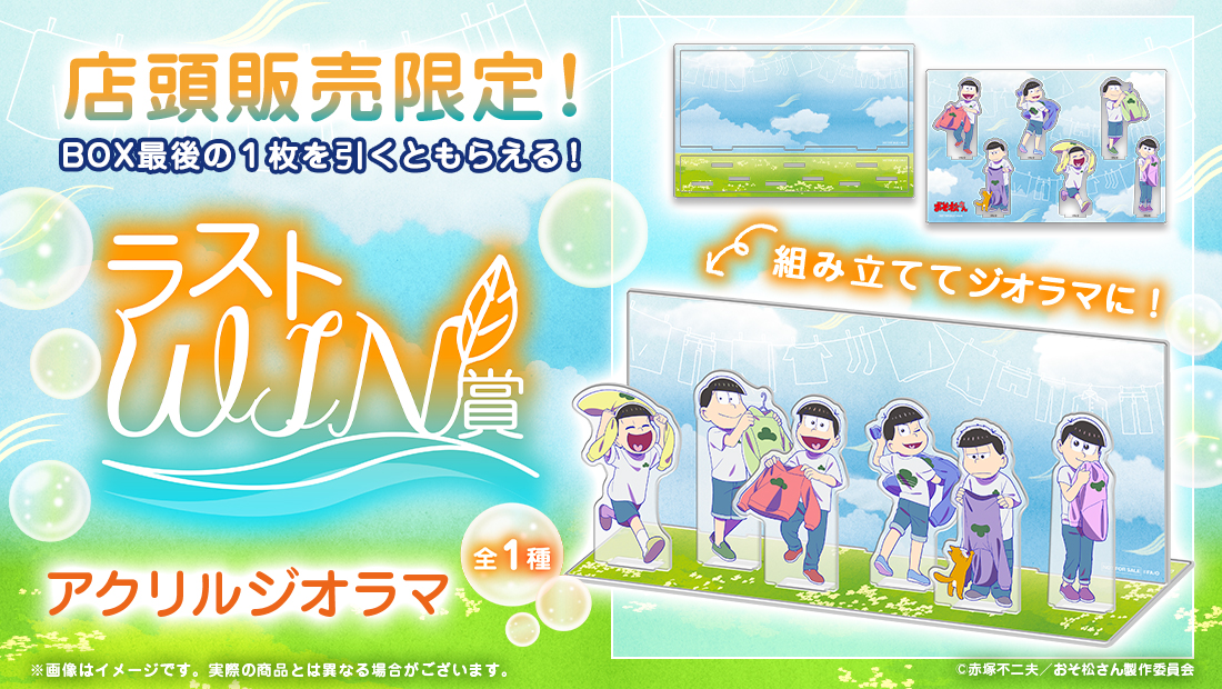 このくじはBOXタイプです! くじのタイプについて現在このくじは販売していません販売店舗一覧ラウンドバッグ全1種類集合イラストを使用した、持ち運びに便利なラウンドバッグです! ※本商品のイメージ画像はデザイン上の参考として掲載しております。 実際の商品は、持ち手部分が両側の側面に付いている仕様となっております。 サイズ:H390mm×φ274mm 素材:ポリエステル A3クリアポスター全1種類大きく飾れるA3サイズのクリアポスターです♪ サイズ:H297mm×W420mm 素材:PPアクリルスタンド全6種類描き下ろしイラストを使用したアクリルスタンドです! サイズ:H150mm×W100mm内 素材:アクリル(3mm厚)台座つきアクリルカード全6種類台座に立てかけられるアクリルカードです♪ 本体サイズ:H90mm×W45mm内 台座サイズ:H20mm×W55mm内 本体素材:アクリル(1mm厚) 台座素材:アクリル(3mm厚)アクリルキーホルダー全6種類いつでも一緒に持ち歩けるアクリルキーホルダーです♪ サイズ:H70mm×W50mm内 素材:アクリル(3mm厚),金属A4アートボード全6種類描き下ろしイラストを楽しめるA4サイズのアートボード! 額に入れて飾ると素敵です♪ サイズ:H297mm×W210mmほど(A4相当) 素材:厚紙(合紙)大缶バッジ全12種類大きいサイズのコレクション缶バッジです♪ サイズ:Φ76mm 素材:ブリキ特大アクリルスタンド全6種類BOXのくじをすべて引き終えると必ずもらえる豪華特典! 高さなんと約30cmの超特大サイズのアクリルスタンド! ※オンライン販売と店頭販売で商品が異なります。 サイズ:高さ約300mm(キャラによって異なる) 素材:アクリル(3mm厚)コースター全6種類1会計につき5枚購入ごとにランダムで1枚必ずもらえる、全6種のコースター! (10枚まとめて購入時はランダムで2枚もらえます) サイズ:H90mm×W90mm 素材:厚紙アクリルパネル全1種類くじ購入枚数がそのまま応募数に! くじを購入されたお客様の中から抽選で6名様に「アクリルパネル」をプレゼント! ※店頭で購入された方はくじ半券のシリアルコードを使って応募いただけます。 サイズ:H150mm×W235mm 素材:アクリル(3mm厚),金属