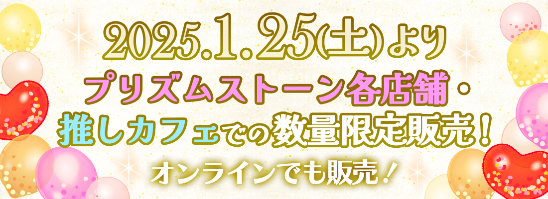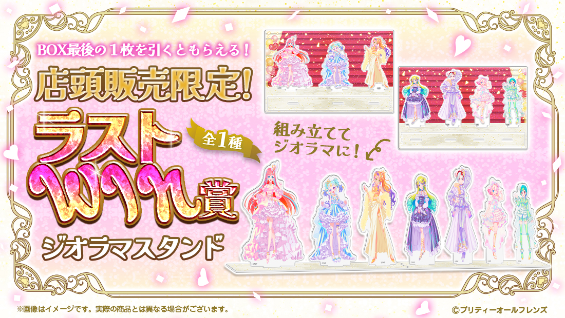 このくじはBOXタイプです! くじのタイプについて現在このくじは販売していません販売店舗一覧アクリルパネル全1種類迫力ある大きさのアクリルパネル! サイズ:H235mm×W200mmほど 素材:アクリル(3mm厚),金属(足パーツ)デカアクリルスタンド全7種類とても大きいサイズのアクリルスタンドです♪ サイズ:高さ最長250mm(種類によって異なります) 素材:アクリル(3mm厚)チケット風クリアカード全7種類チケット風デザインに仕上げたクリアカード。 ボールチェーンを通してカバンに垂らしてもインパクトのある大きさです♪ サイズ:H148mm×W55mm 素材:PVC,ボールチェーンアクリルブロックコレクション全7種類厚手のアクリルを使用した、ブロック状のコレクショングッズです♪ サイズ: H50mm×W50mm 素材:アクリル(8mm厚)オーロラアクリルキーホルダー全7種類コーデ合わせのオーロラ素材が可愛いアクリルキーホルダーです♪ サイズ:H70mm×W50mm以内 素材:アクリル(3mm厚),ナスカンA4アートボード全8種類アイドルたちのサイン入り!A4サイズのパネルです! 額にいれて飾るのも素敵ですね♪ サイズ:H297mm×W210mmほど(A4相当) 素材:厚紙(合紙)缶バッジ・ステッカーセット全7種類オーロラ仕様のステッカーと缶バッジがセットになったお得な賞です♪ 缶バッジ サイズ:φ57mm 素材:ブリキ ステッカー サイズ:H90mm×W55mm内 素材:アートタック紙等身大タペストリー全7種類BOXのくじをすべて引き終えると必ずもらえる豪華特典!高さなんと約190cmの等身大タペストリーです♪ お好きな1種類をお選びいただけます。 ※オンライン販売と店頭販売で商品が異なります。 サイズ:H1880mm×W700mm 素材:ポリエステル(スエード)コースター全7種類1会計につき5枚購入ごとにランダムで1枚必ずもらえるコースター! (10枚まとめて購入時はランダムで2枚もらえます) ※こちらはオンラインでくじを購入された方のみでのプレゼントとなります。 店頭での配布はございませんので、ご了承ください。 サイズ:H90mm×W90mm 素材:厚紙ジオラマスタンド全1種類くじ購入枚数がそのまま応募数に! くじを購入されたお客様の中から抽選で10名様に販売を記念したジオラマスタンドをプレゼント! ※オンライン販売のみの応募特典となります。 ※店頭販売限定のラストWIN賞と同じ商品となります。 サイズ:H235mm×W150mm×2枚 素材:アクリル