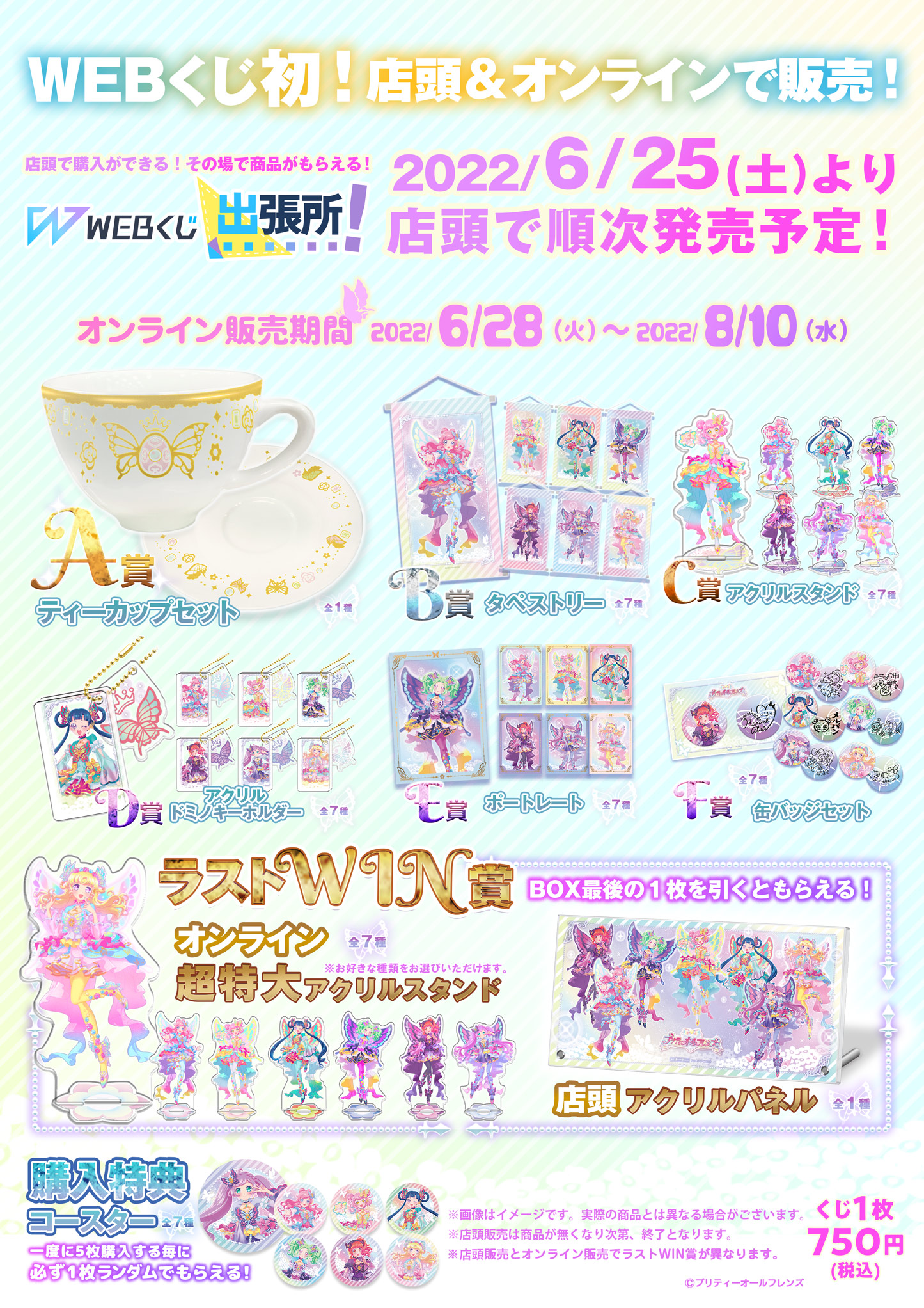 このくじはBOXタイプです! くじのタイプについて現在このくじは販売していませんティーカップセット全1種類ゴーゴー!マスコッツと今回のコーデをモチーフにデザインされたカップとソーサーのセットです♪ サイズ:H68mm×直径77mm、ソーサー直径148mm 素材:陶器タペストリー全7種類オリジナルサイズの大きいタペストリーです! サイズ:H634mm×W345mm 素材:スエード/塩ビパイプ/紐アクリルスタンド全7種類大きいサイズのアクリルスタンドです! 並べて部屋に飾りたいですね♪ サイズ:高さ最大13.5cm(キャラによって異なる) 素材:アクリル(3mm厚)アクリルドミノキーホルダー全7種類奥行きのある厚いアクリルドミノに、コーデをモチーフにしたチャームをセットにしたキーホルダーです♪ サイズ:ドミノ(50mm×30mm)、チャーム(35mm×30mm) 素材:アクリル(5mm厚、3mm厚)、ボールチェーン(金属)ポートレート全7種類金の箔押しデザイン入り。美麗な印刷でグッズ化したポートレートです♪ サイズ:本体サイズ:B5(約H257mm×W187mm) 台紙サイズ:A4(約H297mm×W210mm) 素材:紙缶バッジセット全7種類缶バッジ2個セットです!サイン缶バッジはメタリック仕様で綺麗な仕上がりになってます♪ サイズ:φ54mm 素材:ブリキ超特大アクリルスタンド全7種類BOXのくじをすべて引き終えると必ず当たる豪華特典!ジュエルのつばさを広げた、高さなんと約30cmの超特大サイズのアクリルスタンドです♪ サイズ:高さ270mm~300mm(キャラによって異なる) 素材:アクリル(5mm厚) ※店頭販売とは商品が異なります。コースター全7種類一度のご注文でくじを5枚購入ごとに1枚必ずもらえます!厚紙製。全7種。サイズ:φ90mmA2タペストリー全1種類くじ購入枚数がそのまま応募数に!くじを購入されたお客様の中から抽選で10名様に 「A2タペストリー」をプレゼント! サイズ:H420mm×W594mmほど(A2相当) 素材:スエード/塩ビパイプ/紐
