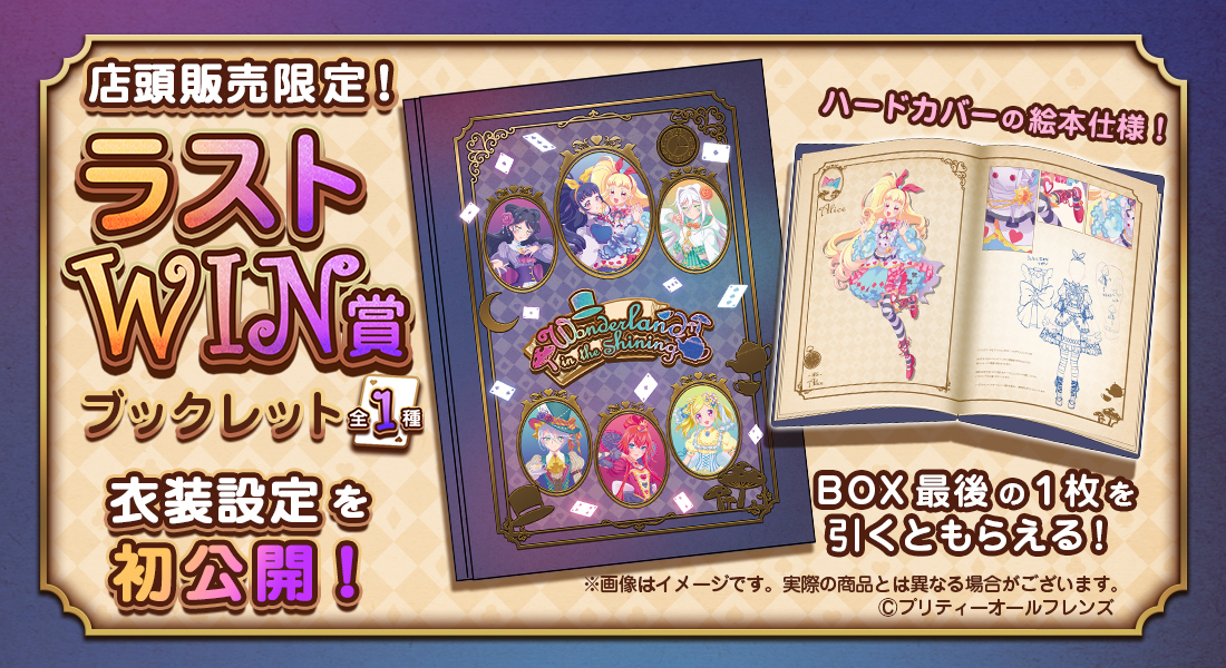 このくじはBOXタイプです! くじのタイプについて現在このくじは販売していません販売店舗一覧ケーキプレートセット全1種類シルエットやロゴがデザインされた、ケーキプレートの2枚セットです。 楽しいお茶会をお過ごしください♪ サイズ:大プレート…直径210mm/小プレート…直径140mm 素材:陶器アクリルパネル全1種類アリスとイブ、2人の大きなアクリルパネルです♪ サイズ:H235mm×W200mm(金具パーツ2個付属) 素材:アクリル(3mm厚)/金属(足パーツ) タペストリー全7種類オリジナルサイズの大きいタペストリーです♪ サイズ:H634mm×W345mm 素材:スエード/塩ビパイプ/紐ティースプーンセット全7種類ティースプーン2個セットです。専用のケース入りです! 紅茶だけでなくスイーツ等にもお使いいただけます♪ 外装サイズ:H60mm×W145mm×D20mm 素材:ステンレススチール/ポリウレタンアクリルスタンド全7種類大きいサイズのアクリルスタンドです。 並べて部屋に飾りたいですね♪ サイズ:高さ最大150mm(キャラによって異なる) 素材:アクリル(3mm厚)クリアファイル・ステッカーセット全7種類A4サイズのクリアファイルと、オリジナルサイズのステッカーセットです♪ クリアファイル サイズ:H310mm×W220mm 素材:PP ステッカー サイズ:H104mm×W74mm 素材:アートタック紙缶バッジセット全7種類缶バッジ2個セットです!サイン缶バッジはメタリック仕様で綺麗な仕上がりになってます♪ サイズ:φ54mm 素材:ブリキ特大アクリルスタンド全7種類BOXのくじをすべて引き終えると必ずもらえる豪華特典! 高さなんと約30cmの超特大サイズのアクリルスタンドです♪ サイズ:高さ270mm~300mm(キャラによって異なる) 素材:アクリル(3mm厚)コースター全7種類一度のご注文でくじを5枚購入ごとに1枚必ずもらえます!全7種。(オンライン販売のみ) サイズ:φ90mm 素材:紙アクリルパネル ソルル・ルルナver.全1種類くじ購入枚数がそのまま応募数に!くじを購入されたお客様の中から抽選で10名様に、 ソルル・ルルナver.のアクリルパネルをプレゼント! サイズ:H235mm×W200mm(金具パーツ2個付属) 素材:アクリル(3mm厚)/金属(足パーツ)