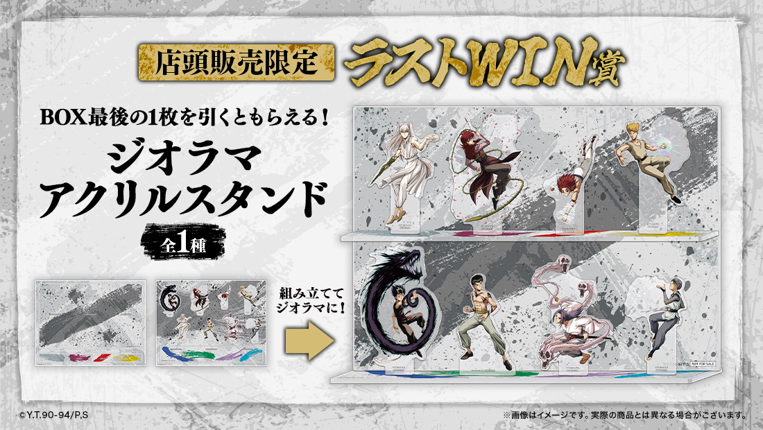 このくじはBOXタイプです! くじのタイプについて現在このくじは販売していません販売店舗一覧アクリルビジュアルパネル全2種類迫力ある描き下ろしイラストを楽しめる、A4サイズのアクリルビジュアルパネル! ふたつ並べて飾りたくなります♪ サイズ:H297mm×W210mmほど(A4相当) 素材:アクリル(3mm厚),金属(足パーツ)マルチBOX全2種類色んなものを整理できるマルチBOXです! 使用しない時にはコンパクトに折りたためます♪ サイズ:H260mm×W380mm×D230mm 素材:ポリエステル,麻デカアクリルスタンド全8種類大きいサイズのアクリルスタンドです! 並べ方次第で戦闘中のような配置にできます♪ サイズ:高さ最長235mm(種類によって異なります) 素材:アクリル(3mm厚)フタのるマスコット全8種類過去のWEBくじ描き下ろしイラストを使用したリバイバルアイテム! 今回は冬のテーマのイラストを、スノードームに閉じ込めたイメージに♪ ペットボトルの蓋に被せることができます! コレクションして飾ってくださいね♪ アクリルサイズ:H70mm×W50mm内 キャップサイズ:H16.7mm×φ34mm内 本体素材:アクリル(3mm厚) キャップ部分:PEA4アートボード全9種類描き下ろしイラストを楽しめるA4サイズのアートボード! 額に入れて飾ると素敵です♪ サイズ:H297mm×W210mmほど(A4相当) 素材:厚紙(合紙)ステッカーセット全8種類スマホケースなどに入れられるサイズのステッカー3種セット! お好きなところでお使いいただけます♪ サイズ:(キャラ)H70×W60mm内/(正方形)H50×50mm内/(技名)H50×25mm内 素材:アートタック紙大缶バッジ全8種類大きいサイズのコレクション缶バッジです♪ サイズ:φ76mm 素材:ブリキ特大タペストリー全8種類今回の迫力ある描き下ろしイラストを堪能できる特大サイズのタペストリーです! 壁に掛けて飾ると壮観ですよ♪ サイズ:H1100mm×W515mm 素材:ポリエステル,スエードコースター全8種類1会計につき5枚購入ごとにランダムで1枚必ずもらえる、全8種のコースター! (10枚まとめて購入時はランダムで2枚もらえます) ※こちらはオンラインでくじを購入された方のみのプレゼントとなります。 店頭での配布はございませんので、ご了承ください。 サイズ:H90mm×W90mm 素材:厚紙アクリルパネル全1種類くじ購入枚数がそのまま応募数に! くじを購入されたお客様の中から抽選で10名様に「アクリルパネル」をプレゼント! 店頭で購入された方はくじ半券のシリアルコードを使って応募いただけます。 サイズ:H150mm×W235mm(金具パーツ2個付属) 素材:アクリル(3mm厚),金属
